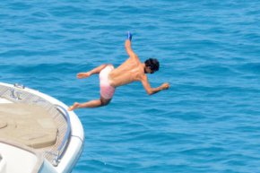 Матадора отпразнува 30-ия си рожден ден на 3 юни в средиземноморския оазис и остана там още няколко дни. Фотографите уловиха Надал да прави няколко зрелищни каскади във водата, но през цялото време Рафа неизменно носеше предпазната шина на ръката си.