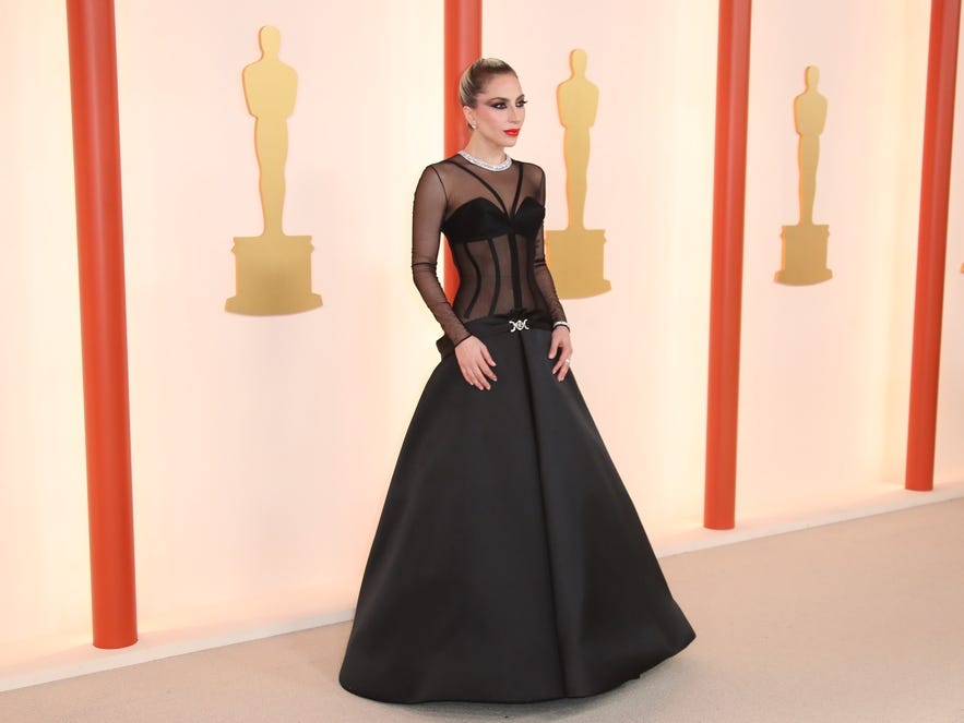 Никол Кидман облече черна рокля от Armani Prive с флорални мотиви и висока цепка. Лейди Гага дойде на церемонията в красива рокля Atelier Versace с полупрозрачна горна част.