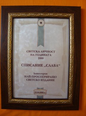 Списание СЛАВА бе наградено с грамота за най-проспериращо светско издание на церемонията по награждаването за Светска личност на годината 2010 по време на Четвъртия Руски бал, организиран от пиара и продуцента Евгени Минчев. Неговата дама на вечерта Мис Антония Петрова, както и други ВИП гости на събитието, поздравиха списанието и му пожелаха да бъде все така интересно за читателите. Абсолютно безкористно и заслужено СЛАВА бе избрана и отличена като най-успешна сред немалката конкуренция от други български списания. В категорията Светски репортер грамота взе Магдалена Гигова от вестник Труд. Отличието за Бизнесмен на годината отиде в ръцете на г-н Магдален Димитров, а за Бизнесдама бе обявена хотелиерката Бисерка Хънкова. В категорията Дебют с грамоти си тръгнаха младата бизнесдама Зария Кучарска и д-р Невен Енчев.
