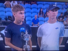Българинът Димитър Кисимов, вляво, е първият наш победител в Откритото първенство на Австралия по тенис - един от четирите турнира в Големия шлем. Той взе купата на двойки при младежите, заедно с южноафриканския си партньор Конър Дойг тази нощ.