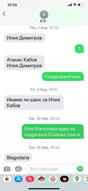 B B споменава имената на двамата футболисти, на което Божков отговаря Следващия мач. Ден по-късно - на 2 август, предполагаемият Борисов пита "Имаме ли шанс за Илия Кабов?" (името е сбъркано). От "Витоша" обявиха привличането на двамата на 6 август.