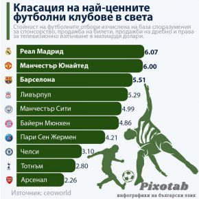 Реал Мадрид, клуб е кралска особа както по име, така и по величие. С множество местни и континентални шампионати зад гърба си, базираният в Мадрид отбор доминира в спорта от самото му създаване. Клубът седи на върха на футболната финансова пирамида благодарение на своите бизнес начинания и широка привлекателност. Отборът, наречен „Лос Бланкос“, отбеляза 19% увеличение на стойността си за по-малко от година, достигайки до впечатляващите 6,07 милиарда долара, което ги прави най-ценният футболен отбор в света.