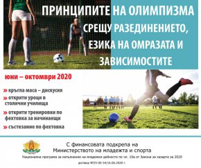 Проектът "Принципите на олимпизма срещу разединението, езика на омразата и зависимостите" се осъществява с финансовата подкрепа на Министерството на младежта и спорта, по НПИМД по чл. 10а от Закона за хазарта.