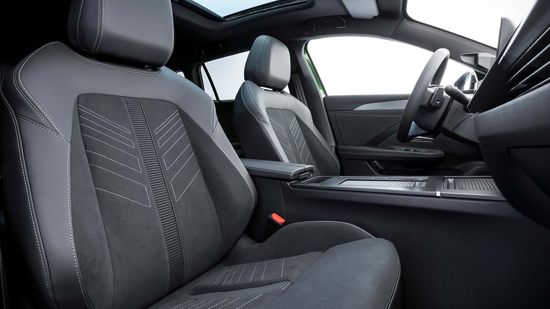 В интериора на Astra 2026 акцентът е върху комфорта. Всички версии вече имат стандартни по-удобни седалки Intelli-Seats, изработени изцяло от рециклирани материали. Опционално се предлагат масажиращи седалки с памет и електропневматична лумбална поддръжка.