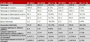 Това допринесе за добрите резултати в мобилния сегмент на компанията, където се отчита по-високо търсене на премиум мобилни планове и дигитални услуги. Като резултат приходите от мобилни услуги се увеличават с 8,2% през второто тримесечие и достигат 71,9 млн. евро, а средният приход от абонат (ARPU) бележи ръст от 9,8% до 6,4 евро.