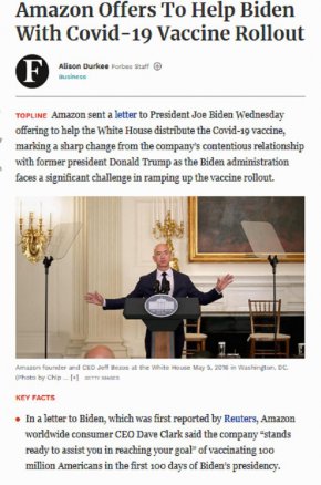 Amazon изпрати писмо до президента Джо Байдън, предлагайки да помогне на Белия дом да разпространи ваксината Covid-19, отбелязвайки рязка промяна в спорните отношения на компанията с бившия президент Доналд Тръмп, тъй като администрацията на Байдън е изправена пред значително предизвикателство при увеличаване на разпространението на ваксината, съобщава Форбс.