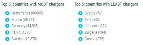 Дори разликата между третия в подреждането, Германия (която представлява 19,9% от всички зарядни станции в ЕС) и четвъртия Италия (чийто дял достига 5,8%) е значителна.