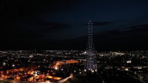 Безпилотни самолети осветяват нощното небе в Новгород, Русия в чест на руския космонавт Юрий Гагарин, който направи история преди 60 години, като стана първият човек в КОСМОСА.