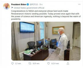 "Поздравления за НАСА и всички, чиято упорита работа направи възможно историческото кацане на Perseverance. Днес за пореден път доказа, че със силата на науката и американската изобретателност нищо не е извън сферата на възможностите", написа в Туитър президентът на САЩ Джо Байдън.