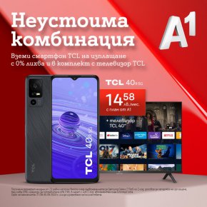 Следващият смартфон от селекцията e TCL 40R 5G, който се предлага в нестандартен комплект с 40-инчов Full HD смарт телевизор TCL 40S6200. Смартфонът дава достъп до гигабитовите скорости на 5G ULTRA мрежата на оператора и разполага с четворна камера - 50MP основна, 2MP дълбочинна , 2MP макро и 8MP предна камера. Комплектът може да бъде закупен с мобилен план Unlimited на цени от 14,58 лева на месец.