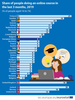 Сред страните-членки на ЕС се открояват скандинавските страни Финландия и Швеция. През последното тримесечие на 2019 г. онлайн курсове са преминали 21% от анкетираните във Финландия, докато в Швеция този дял е 18%. Следват Испания (15%), Естония (14%), Ирландия и Холандия (13%).