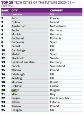 София се класира 20-а в годишната техно ранглиста на Европейските градове на бъдещето. Пред нас е Хелзинки, зад нас остава италианската индустриална и финансова столица Милано, Прага, главният град на е-държавата Естония – Талин и другите в Топ 25, избрани от хилядите градове на континента. Лондон, Париж и Дъблин са в челната тройка. Най-предно класиране от Централна и Източна Европа има Букурещ, който е седми, другите са само Варшава на 15-о и Москва на 18-о място. През последните години София привлече много световни дигитални лидери, последно технодизивията на немската Комерцбанк, а IT индустрията дава 18% от БВП на българската столица, като е водещ отрасъл, заедно с туризма. За разлика от него обаче тя не пострада от коронакризата.