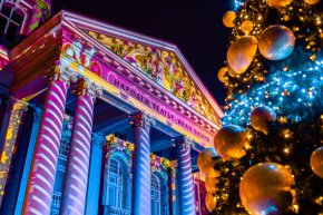 Емблематичната фасада на Народния театър също стана част от спектакъла с помощта на атрактивен 3D мапинг.