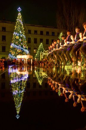 Спектакълът с участието на ансамбъл „Българе“ събра хиляди жители пред Народния театър след запалването на коледната елха на столицата