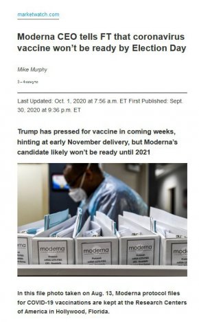 Потенциалната ваксина срещу коронавирус на Moderna Inc. няма да бъде готова до президентските избори в САЩ, на 3 ноември, заяви главният изпълнителен директор на биотехнологичната компания пред Financial Times.