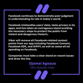 Rakuten Viber, едно от водещите приложения за безплатна и сигурна комуникация, заяви, че преустановява всякакви бизнес отношения с Facebook. Viber ще премахне от платформата си Facebook Connect, Facebook SDK и GIPHY. Също така, всички рекламни разходи в социалната платформа ще бъдат спрени, с което Viber се присъединява към нарастващото глобално движение срещу технологичния гигант #StopHateForProfit.