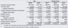 YouTube, който бе закупен от Google през 2006 г., печели от реклама. През 2019 г. приходите на портала надхвърлят 15,1 милиарда долара, докато година по-рано YouTube е донесъл повече от 11 милиарда долара на Alphabet, а през 2017 г. – около 8,1 милиарда долара.