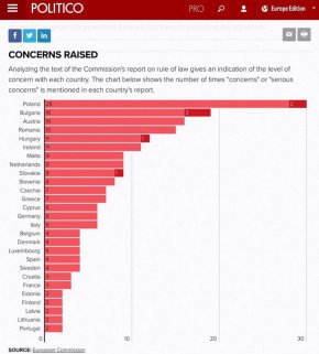 Това е анализът на Европейската комисия във връзка със случаите на опасения от нейна страна за върховенството на закона във всяка страна - членка. В светлочервено са маркирани случаите, когато ЕК има "опасения" по тази тема, а в тъмночервено са случаите в които Комисията има "сериозни притеснения" във връзка с върховенството на закона. Видно от графиката, България е на второ място по общ брои случаи и на първо място по брой на сериозни случаи, в които ЕК има опасения: 16+3 =19 проблема.