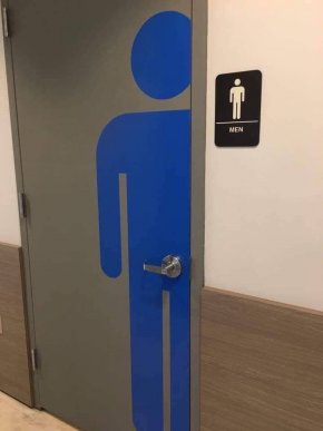 Дръжката на тази врата за мъжката тоалетна е поставена на точното място