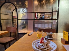 Иначе по съдържание менюто е американизирано за брънч. Има всичко, което може да се очаква - Бенедикт, включително роял със сьомга, бъркани яйца, бургери и каквото можете да си представите до банановия хляб и баската торта, която - странно - и тук наричат чийзкейк, а няма нужда.