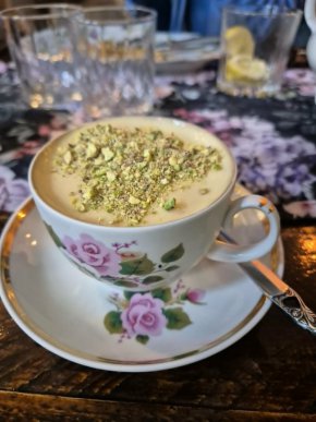 А тирамисуто с крем и ядки от шамфъстък идва в красива чаша от стара колекция. Започваме като филм, в който първо виждате финала, а после излиза кадър, в който пише еди-колко-си време преди това. В нашия случай - около час...