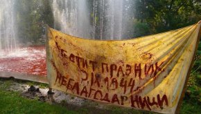 Фонтан в Докторската градина в София беше оцветен в червено. На плакат до него е изписано “9 септември 1944 г. Честит празник, неблагодарници”.