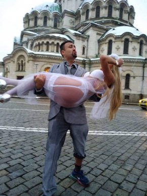 Полугола русокоса мадама по бельо втрещи софиянци, разхождайки се като булка пред храм-паметник Александър Невски в този вид. Момичето се казва Жанета Осипова и е тазгодишната Мис Плеймейт. Меко казано скандалната фотосесия пък е част от снимките за нов чалга клип.