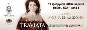 LA TRAVIATA с диригент ЛЮБКА БИАДЖОНИ ще бъде представена точно на 14 февруари (неделя) от 19:00 ч. в Зала 1 на Националния дворец на културата (НДК). Солисти на сценичната опера, която ще зарадва меломаните, навръх празника на виното и любовта, ще бъдат Марта Торбидони – сопран, Михаил Михайлов – тенор и Антон Керемедчиев – баритон. Самата Любка Биаджони не е само диригент. В нейните оперни спектакли тя се грижи за режисурата, декорите, костюмите и дирижирането.