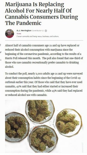 Почти половината от потребителите на канабис на възраст 21 и повече години са заменили или намалили консумацията на алкохол с марихуана от началото на пандемията на коронавируса, според резултатите от проучване на Харис, публикувано този месец. Проучването също така установи, че една трета от тези, които употребяват канабис за развлечение, предпочитат канабиса пред пиенето на алкохол, съобщава Форбс.