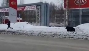 Развълнувано животно беше заснето да преследва мъж по улицата на хладен сибирски град, малко след като избяга от местен хотел, предаде RT.