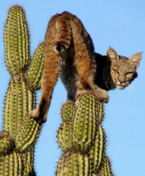 Този червен рис е стоял над 6 часа на върха на над 15-метров кактус, след като избягал от гладен лъв. Гигантският кактус от вида Сагуаро се намира в Аризона и може да достигне възраст до 300 години. Фотографът Кърт Фонгер, 69-годишен, е заснел случилото с камера.
