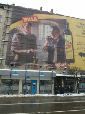 Реклама на Била незаконно окупира тротоара на ъгъла на улиците Г.С. Раковски и Гурко. На снимката може да видите нарушената с пробиване фасада и забитите колове в тротоара.