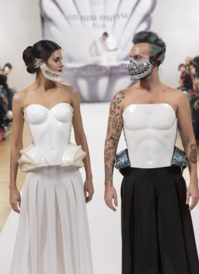 Ясен Самуилов и Ливия Стоянова отново блеснаха на седмицата на модата в Париж. Колекцията носи името на японската богиня на морето и духа на източната митология, изящно комбинирана с елементи от добре позната ни гръцка култура. Българите се заиграват и с мюсюлманския стил за прикриване на лицата.