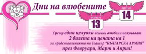 Театър Българска армия провокира влюбените на 14 февруари. В понеделник и вторник само срещу една целувка пред любопитния поглед на касиерката, всяка двойка ще може да вземе два билета на цената на един за всички постановки на театъра през февруари, март и април.