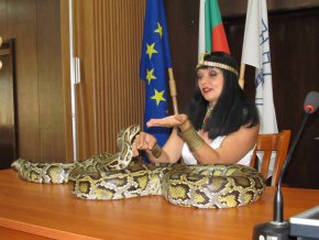 3-метровият женски питон Гигантина е сред атракциите в програма на Българския национален цирк София, който гостува от 9 до 18 юни в Русе. Уникалната снимка с тържествен фон на знамената на ЕС, България и Русе на бюрото на кмета сподели в социалната мрежа журналистката Мария Стойкова.